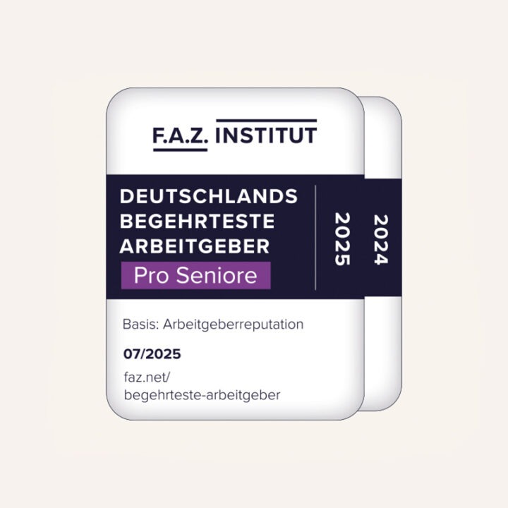 Wir freuen uns über ein großartiges Ergebnis: In einer aktuellen Studie von ServiceValue und dem F.A.Z.-Institut wurden wir als einer der begehrtesten Arbeitgeber 2025 ausgezeichnet – und belegten in der Kategorie „Pflege- und Seniorenheimbetreiber“ den 2. Platz für unsere Marke Pro Seniore.